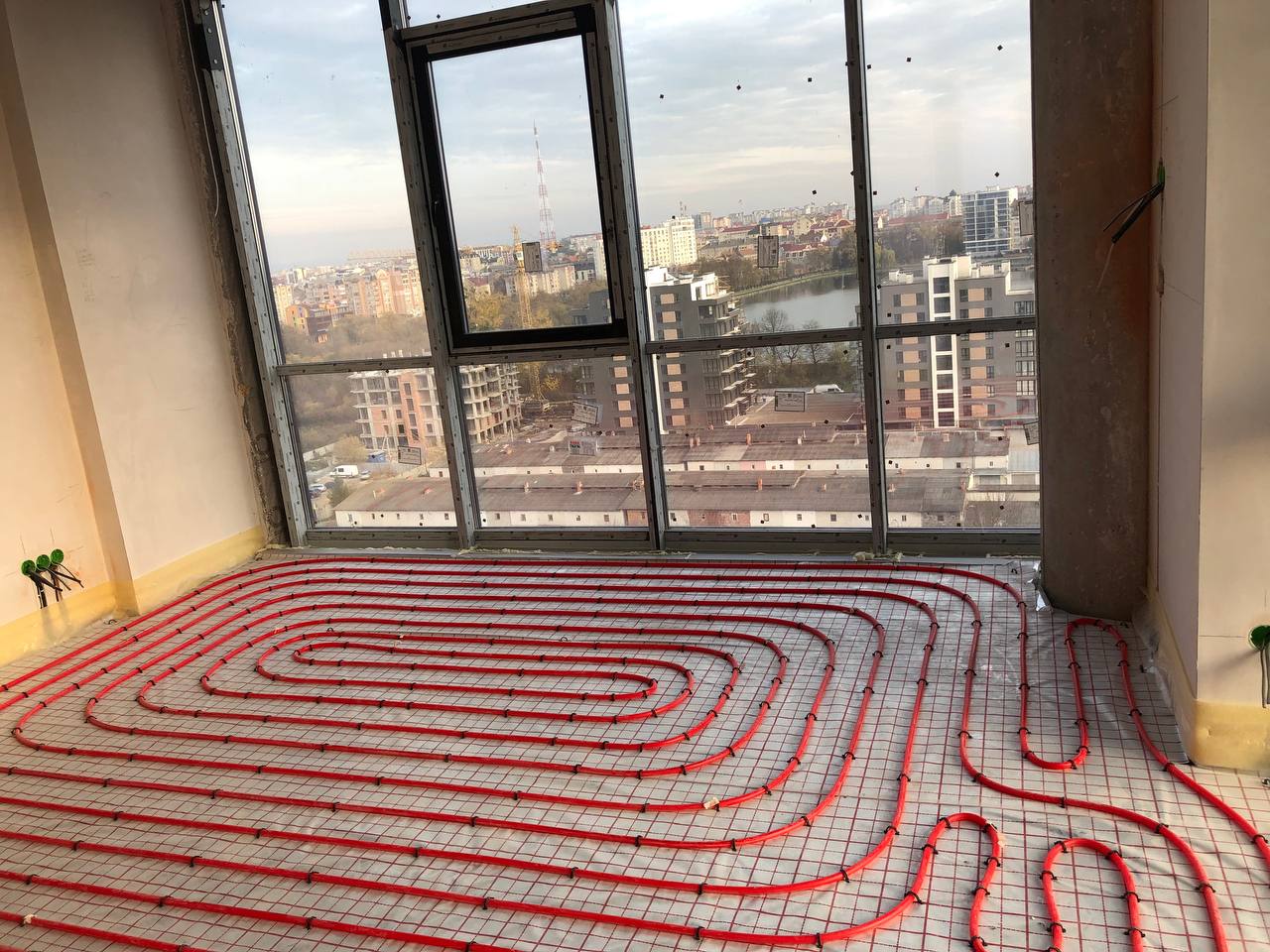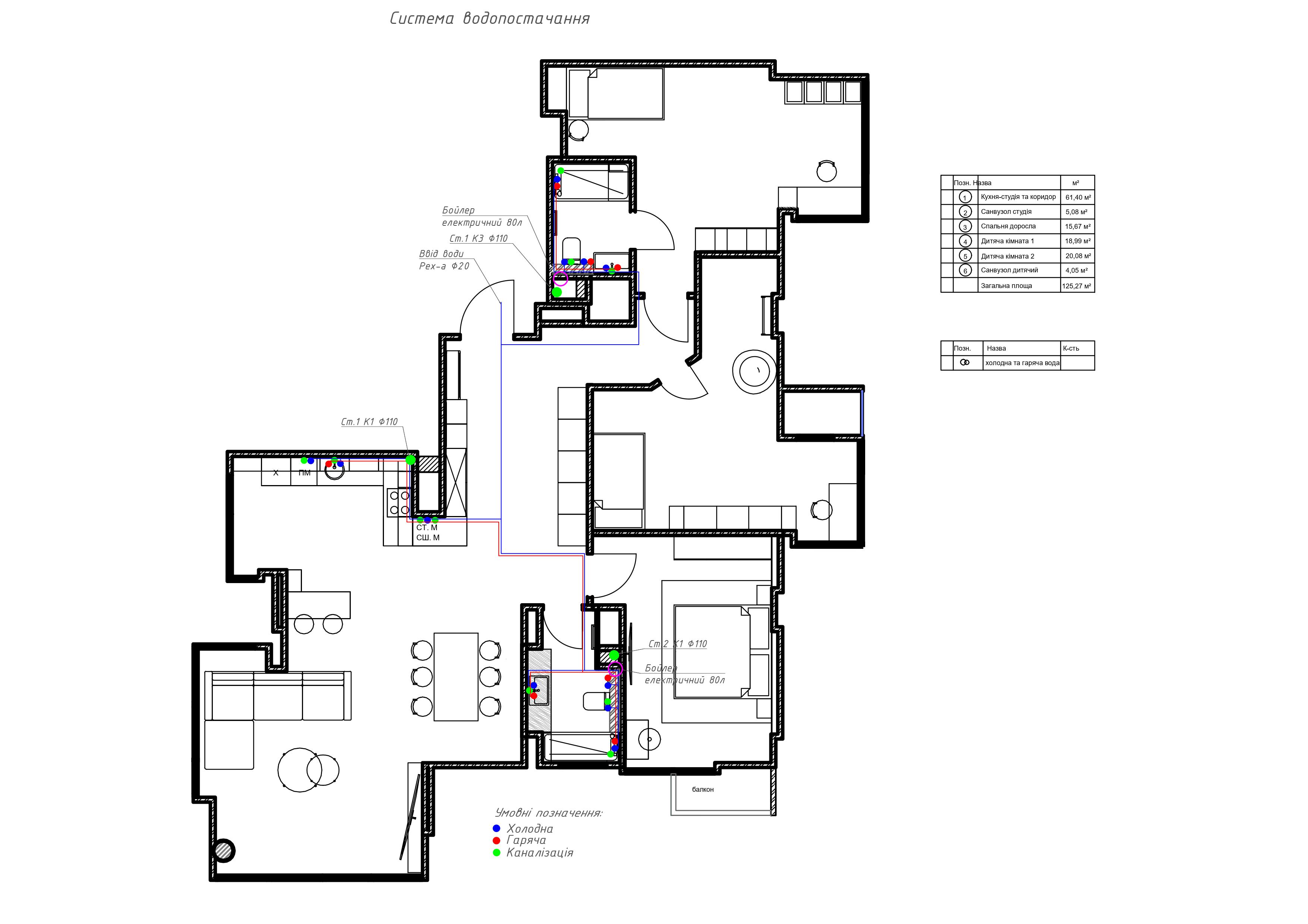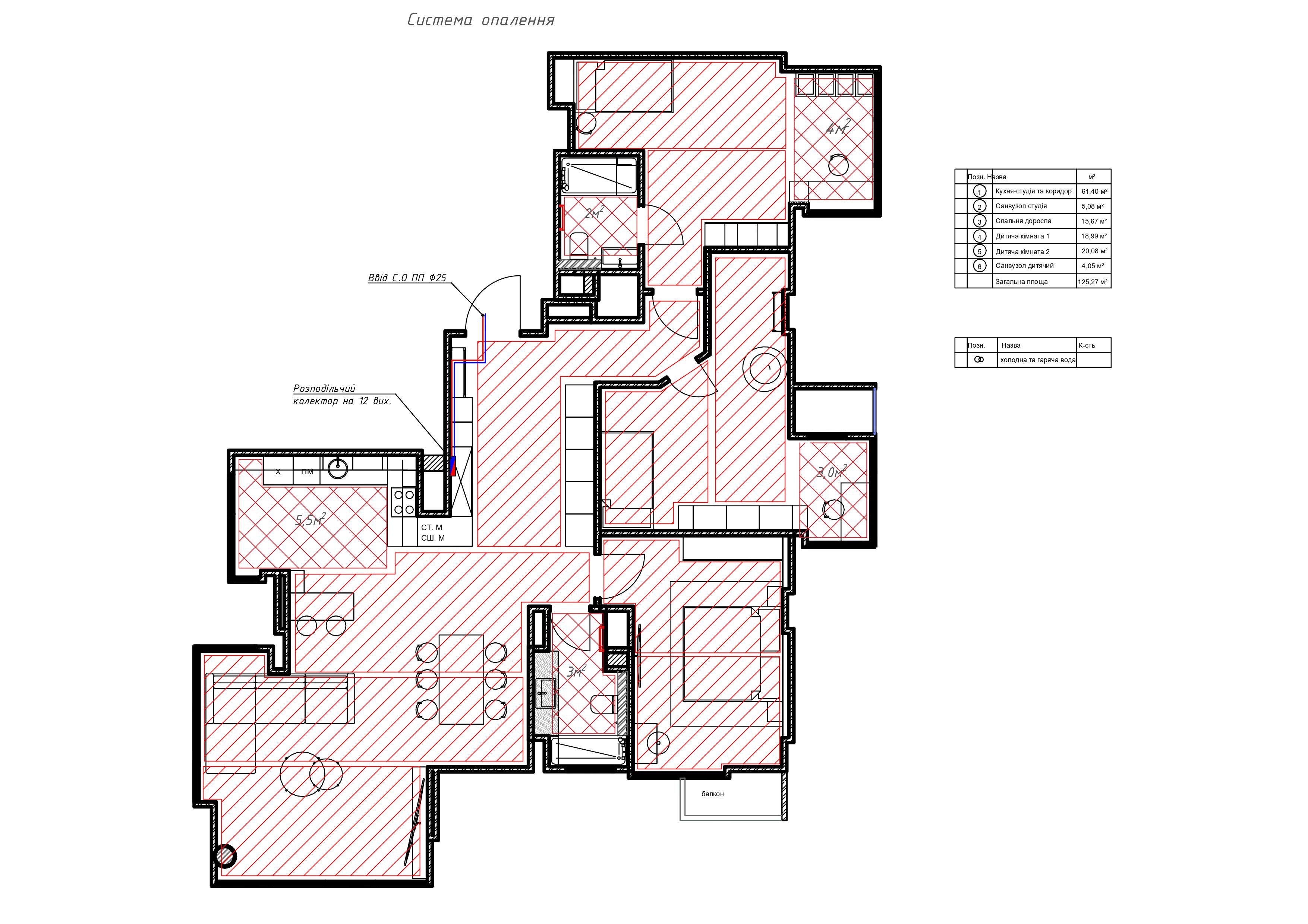 Площа приміщення становить 110 квадратних метрів. Виконано встановлення теплої водяної підлоги з індивідуальним регулюванням завдяки спеціальним терморегуляторам, управління яких здійснюється через бездротову мережу. Для нагрівання гарячої води використовуються бойлери від Thermex та Gorenje, обсягом по 80 літрів кожен.